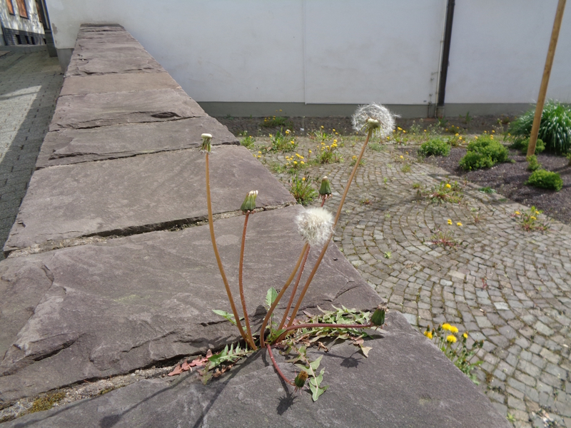 Nebenan zeigt sich der Platz neben der Marienkirche im leuchtenden gelb – wild wuchernder Löwenzahn hat einen besonderen Reiz. Der Platz auf der restaurierten Mauer lädt ein zum ausruhen und entspannen.