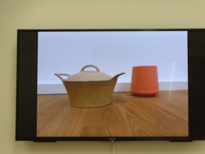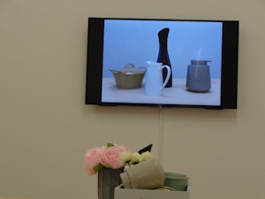 Das aktuelle Blumenarrangement des Konzeptkünstlers des Roji steht in einem der Ausstellungsräume – es greift offensichtlich die Gedanken von Morandi auf -= Schlichtheit. in Form und Farbe. –
