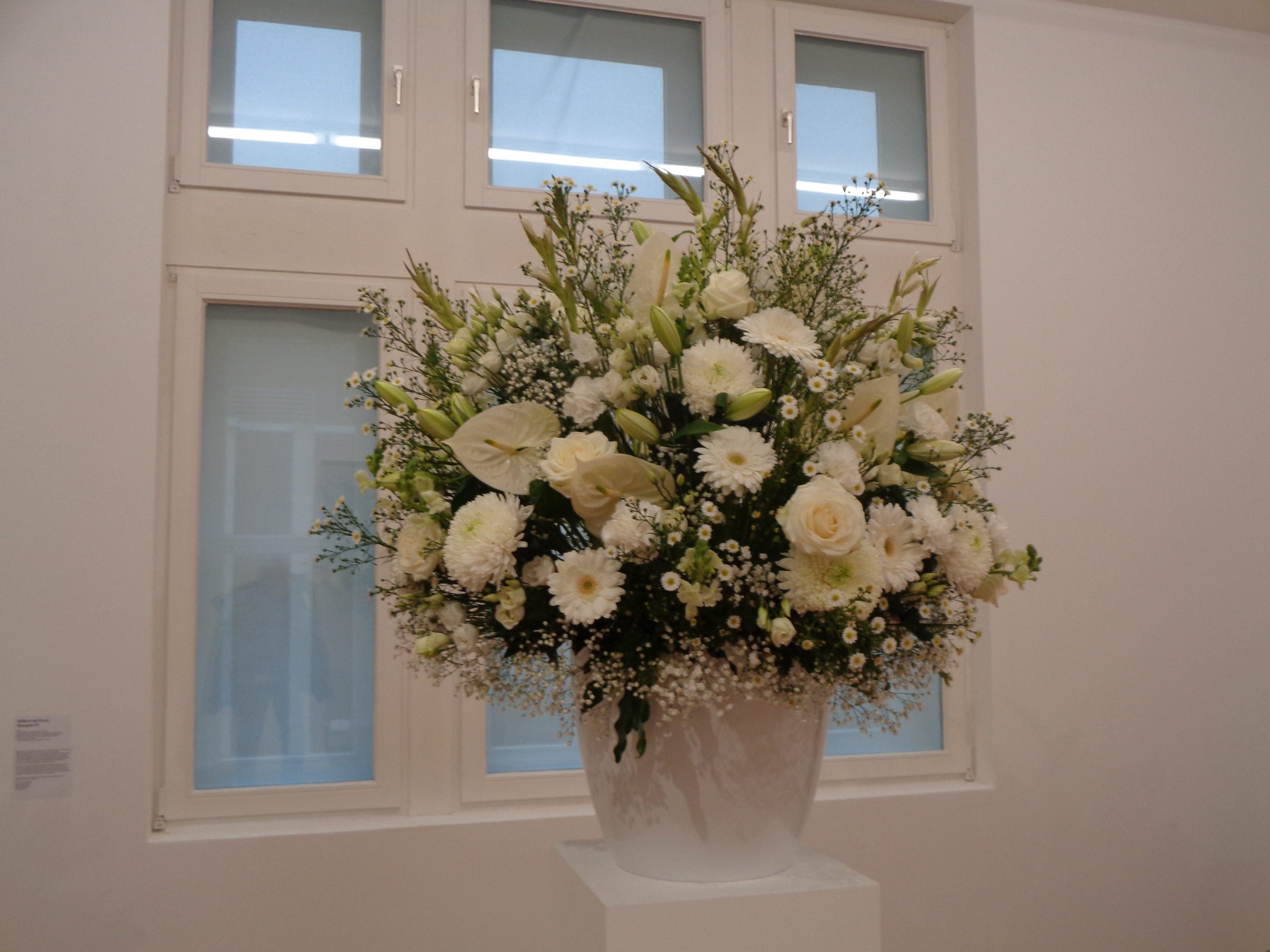 Wi gehen dabei mit der Zeit und greifen neue Ideen und Kunstströmungen auf. Der niederländische Konzeptkünstler Willem de Roji stellt z. B: seit einiger Zeit seine floristischen Arbeiten bei uns aus Ein großes vielfarbiges Blumengesteck wurde gerade abgebaut. – es stand im Foyer und lud ein zum Besuch der Jubiläumsaustellung. – 25 exemplarische Arbeiten aus den letzten 25 Jahren geben einen guten Übeblick über die Entwicklung der zeitgenössenischen Kunst während dear letztem Jahrzehnte.